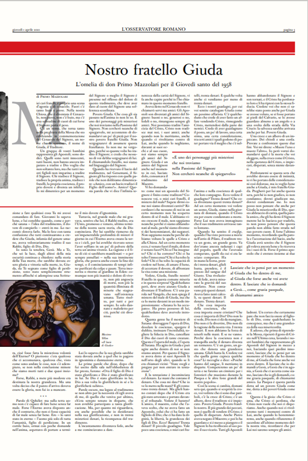 Las páginas interiores del periódico del Vaticano cuentan con un sermón del P. Primo Mazzolari diciendo que cree que Judas fue perdonado por Nuestro Señor; un breve comentario del Card. Carlo Maria Martini sobre el sermón de Mazzolari, diciendo que cada uno de nosotros puede tener un Judas dentro de sí mismo; un texto de Giovanni Papini que sostiene que Judas debe haber tenido un motivo oculto para traicionar a Cristo porque 30 monedas de plata no valían tanto; y un texto de Giuseppe Berto personificando a Judas que afirma que Jesús le debe su glorificación.