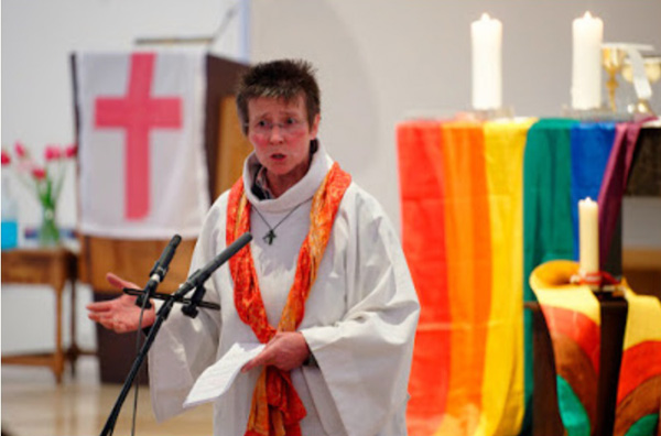 Arriba es Marianne Arndt, asistente parroquial de la Arquidiócesis de Colonia. Ella está predicando durante una Misa en la Iglesia Católica Santa Isabel el 15 de mayo de 2021. En la parte de atrás vemos el altar cubierto con una bandera del arco iris.Esta iniciativa se enmarca en la llamada Vía sinodal de los obispos católicos en Alemania, que es un modelo vanguardista que lucha por aprobar la diaconisa y el "matrimonio" homosexual.