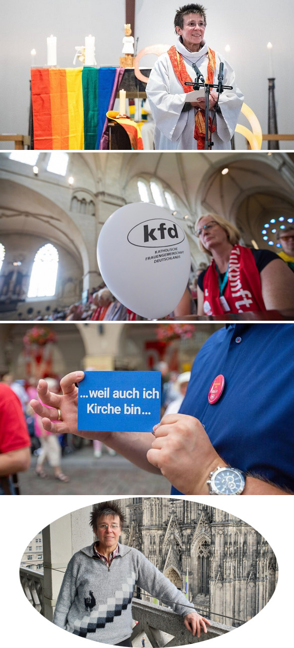 En la segunda fila a continuación, una reunión de la Asociación Alemana de Mujeres Católicas en 2020; tercera fila, una mujer posa con una tarjeta que dice: "... porque también soy Iglesia ...", es decir, las mujeres quieren recibir las órdenes y tener poder decisivo en la Iglesia; última fila , Arndt posa con la Catedral de Colonia como fondo.