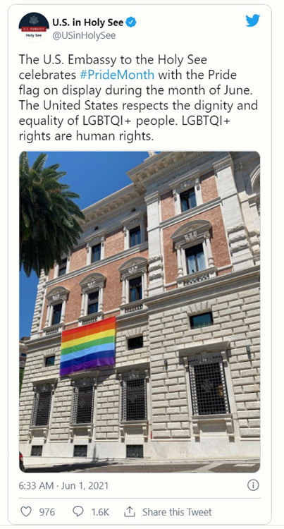 La Embajada de los Estados Unidos ante la Santa Sede anunció el martes 1 de junio de 2021 que mostraba la bandera del arco iris LGBT "Pride" para el mes de junio, que se celebra como el mes del homo "Pride".“Estados Unidos respeta la dignidad y la igualdad de las personas LGBTQI +. Los derechos LGBTQI + son derechos humanos ”, declaró la embajada en Twitter, ver abajo .