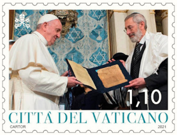 Arriba una reproducción del sello del Papa Francisco dando un códice al rabino Riccardo di Segni en la sinagoga de Roma el 17 de enero de 2016.El sello se emitió el 22 de febrero de 2021, como el primero de una serie de cuatro sellos “interreligiosos” para celebrar el noveno año del pontificado de Francisco.