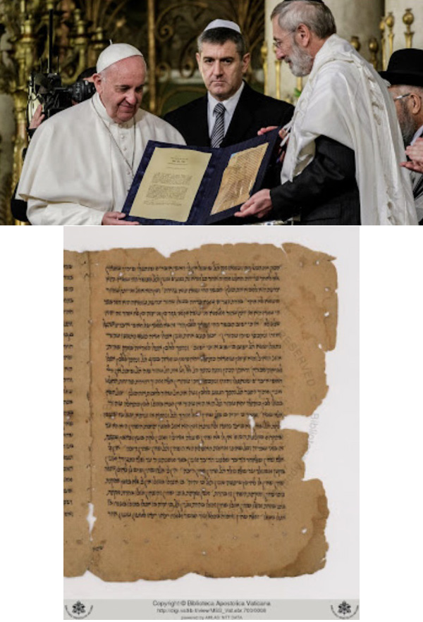 En el sello, Francisco presenta al rabino 5 páginas de un manuscrito judío del siglo XIV que comenta el libro de Levítico, clasificado en los Archivos Vaticanos como Codex Vaticano Ebraico 700 .