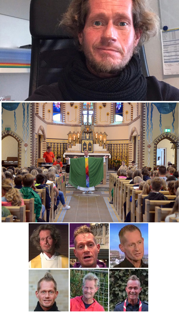 Debajo de la primera fila , el P. Weidisch, dando una entrevista al website homosexual Lulu y manifestando su desacuerdo con la condena del Vaticano de los matrimonios homo. Segunda fila , él - a quien le gusta cambiar su estilo de cabello / rostro muy a menudo; vea las últimas dos filas : decir una misa juvenil en Munster con vestimentas de arcoíris y zapatos tenis.