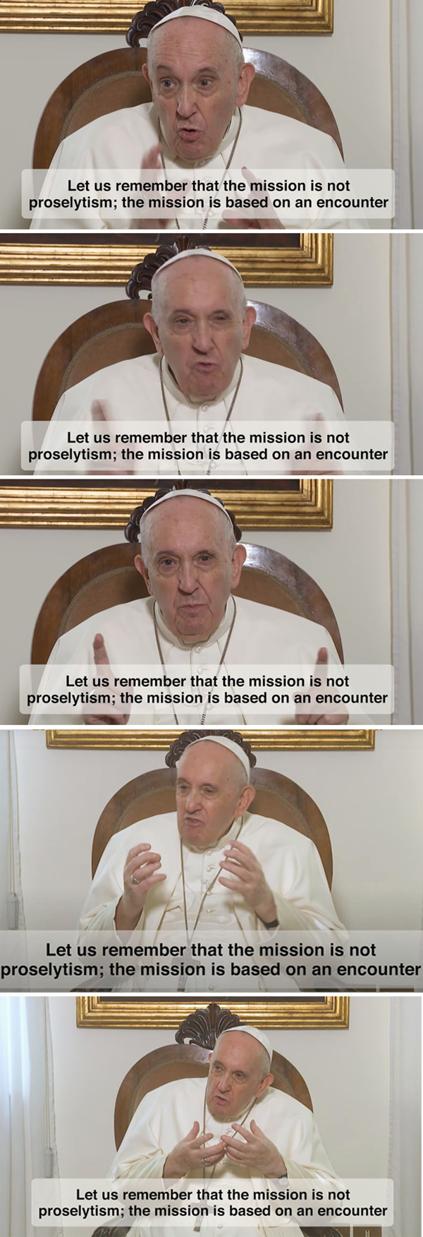 En el video papal más reciente, Francisco ataca enfáticamente el proselitismo católico y afirma que todo apostolado debe basarse en "un encuentro".Él entiende "un encuentro" como el apostolado que hace un católico con su vida ejemplar.