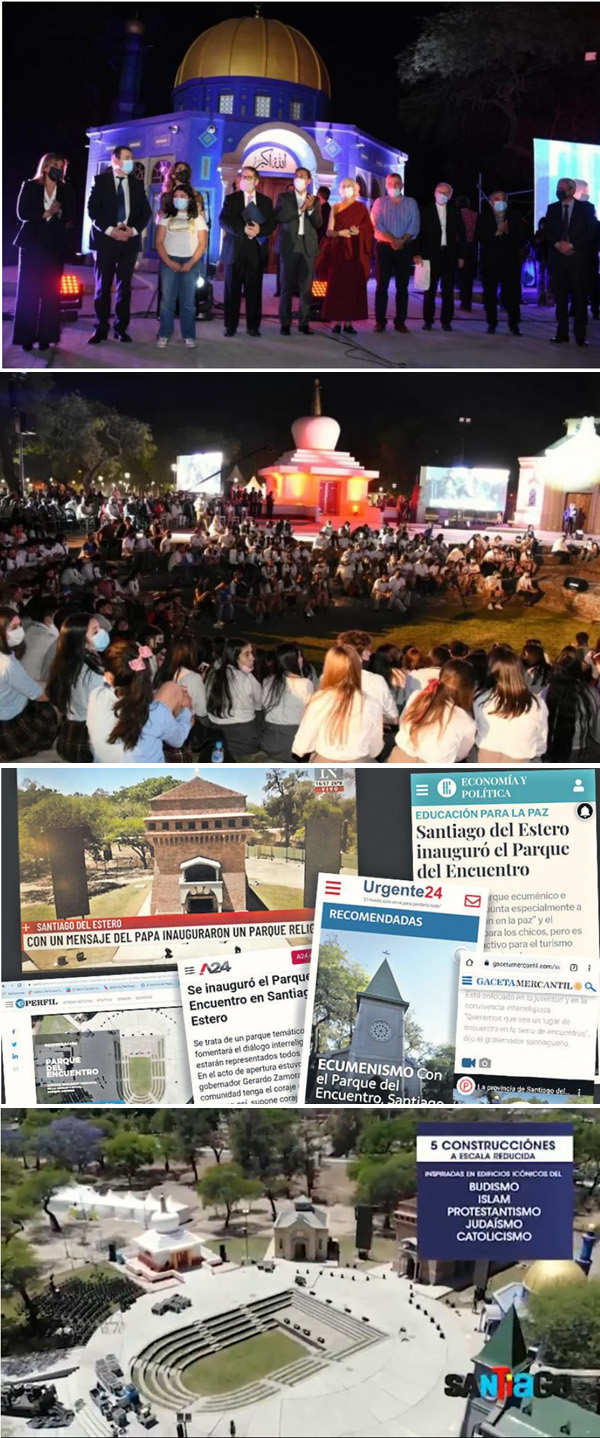 En la ciudad de Santiago del Estero, Argentina, se inauguró una plaza panreligiosa, arriba, el 20 de octubre de 2021, para celebrar el diálogo interconfesional. Fue una iniciativa del gobernador local del estado, Gerardo Zamora.Los pequeños edificios del complejo, que representan cinco religiones: catolicismo, protestantismo, judaísmo, islamismo y budismo, se erigieron en el Parque Aguirre, un área recreativa que incluye áreas de juegos, parrillas, senderos para caminar / trotar y lugares para eventos.