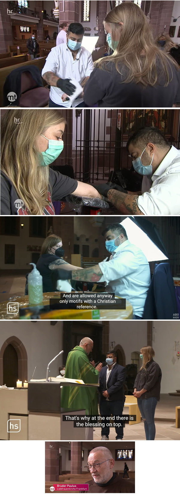 En Frankfurt, Alemania, se lanzó una nueva tendencia el 22 de octubre de 2021. En la Iglesia de Nuestra Querida Señora ( Liebfraenkirche ), el P. capuchino. Paulus Terwitte, arriba a la izquierda, inició el nuevo programa Tatuaje ante el altar.Invitó a un tatuador profesional, Silas Becks, a la iglesia y ofrece tatuajes gratis a los interesados.
