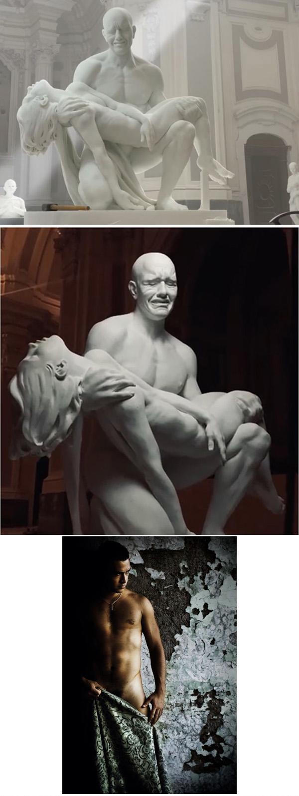 En tercer lugar, parece común en los sitios web homosexuales que los artistas presenten auto-exhibiciones de sus cuerpos, como hizo Cardillo, arriba, o cuerpos masculinos desnudos en abrazos inmorales u obscenos, como en la última fila, fuente aquí. Nuevamente, es bastante similar a la escultura de Cardillo.