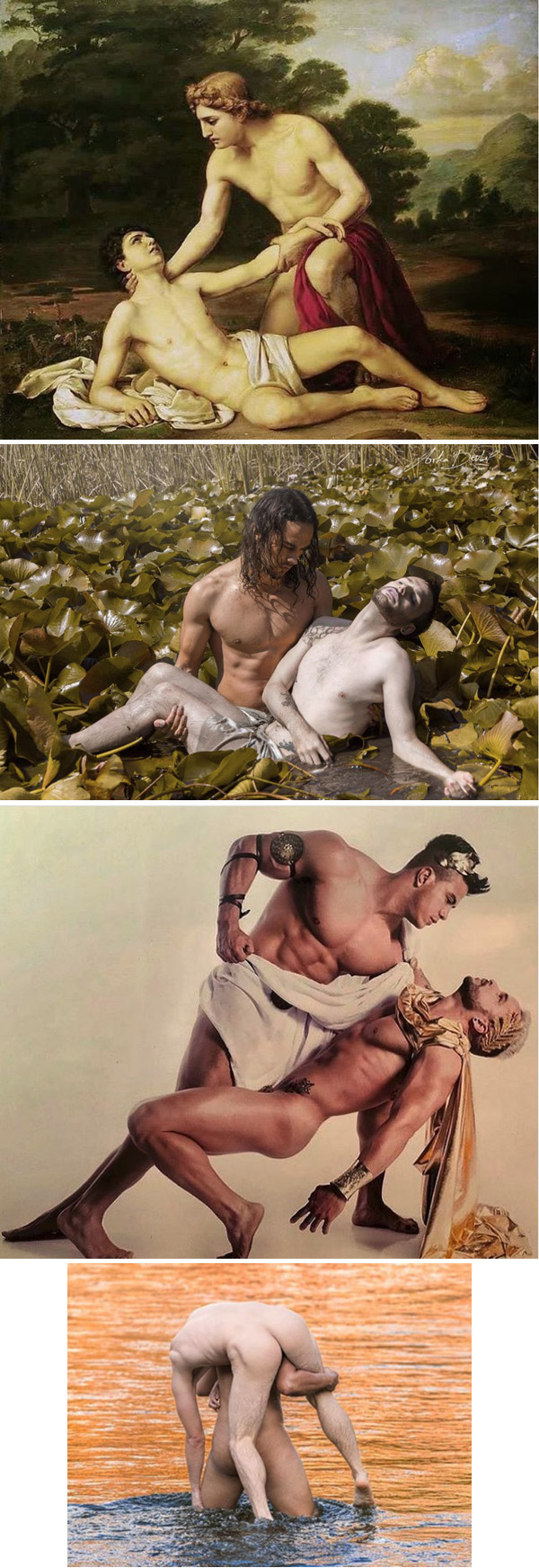 En segundo lugar, a los homosexuales les gusta reproducir pinturas de la mitología pagana en las que Apolo llega a socorrer a su amante masculino moribundo, Hyacinth, cuarta, quinta y sexta filas debajo. Este mito tiene todavía otras reproducciones más incómodas que se acercan a la homo Pietà, que evitamos que nuestros lectores vean.