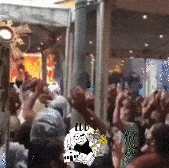 Arriba, lo vemos tratando sin respeto al Santísimo Sacramento, agitándolo como un estandarte de un grupo de samba, tan común en Brasil, abajo.