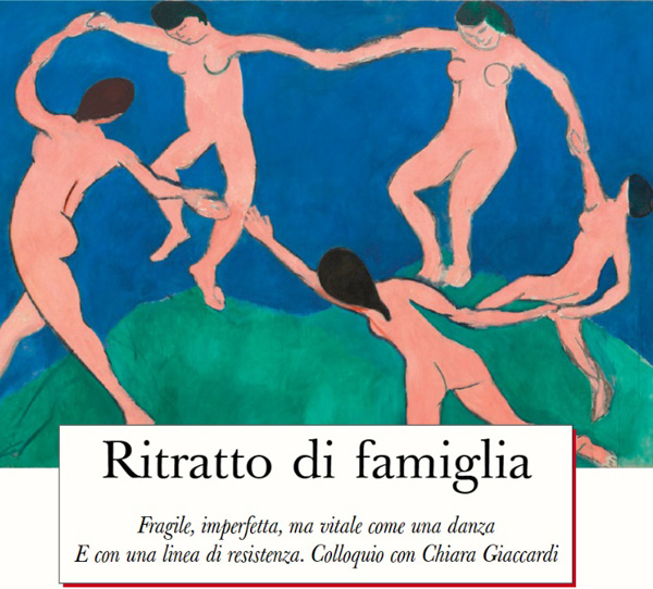 Debajo de la imagen inmoral están las palabras: Retrato de una familia. Frágil, imperfecto, pero vital como una danza. Y con una línea de resistencia. Conversación con Chiara Gioaccardi