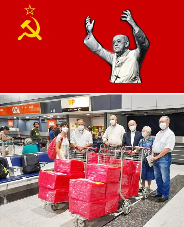 Monseñor Luciano Brito, Vicario General de la Arquidiócesis de Olinda y Recife, Brasil, (arriba, tercero desde la derecha) informa en su Cuenta de Instagram que viajó a Roma el 27 de mayo de 2022. Fue a entregar a la Congregación para la Causa de los Santos del Vaticano copias de todos los escritos del difunto Arzobispo Helder Camara, así como las transcripciones de sus muchos mensajes de radio. Esa compilación será incluida en el proceso de beatificación del Arzobispo de Olinda y Recife.Helder Camara se ganó el apodo de "Arzobispo Rojo" por sus conocidas ideas comunistas. Confirmando este título infame, Mons. Brito ordenó envolver los paquetes de los documentos en plástico rojo, como una forma de decir: "Sí, fue el Arzobispo Rojo y ahora será un santo".