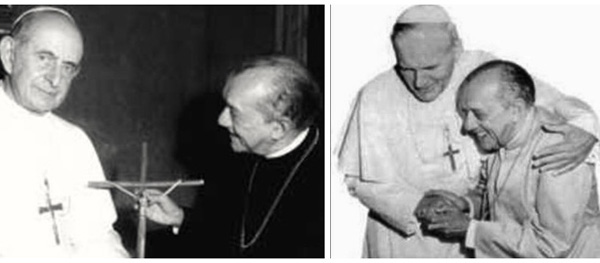 Segunda fila a la izquierda, sosteniendo un libro sobre la Revolución del Desarrollo; centro, con Card. Evaristo Arns, fundador de las Comunidades Cristianas de Base y principal fuerza de la Teología de la Liberación en Brasil, fue responsable por la elección de Lula da Silva y Dilma Rousseff como presidentes de Brasil; derecha, con Card. Leo Suenens, actor importante de la Revolución Conciliar y fundador del Movimiento Carismático.