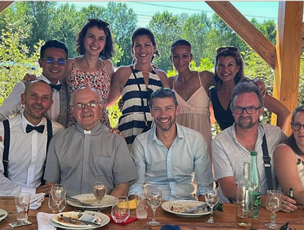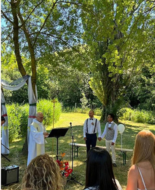 En las afueras de Nimes, Francia, tuvo lugar una ceremonia litúrgica en la que el P. Andre Chapus, ataviado con las vestiduras de Misa y con una Cruz cerca, acogía a una pareja homosexual, arriba. Esta liturgia de bienvenida se parecía mucho a un "matrimonio", o al menos a una "bendición" de la pareja.La ceremonia fue seguida por una comida, abajo, donde estuvieron presentes muchos de los invitados a la ceremonia.