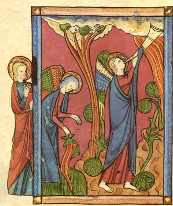 En la isla de Patmos, San Juan, izquierda, recibe una visión del Apocalipsis. |