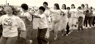 "Muchos conventos de nuestros días tienen una atmósfera de Mardi-Gras". Arriba, hermanas de 115 congregaciones estadounidenses "bailan en línea" en una conferencia en Chicago (junio de 2002) discutiendo el futuro de la vida religiosa .