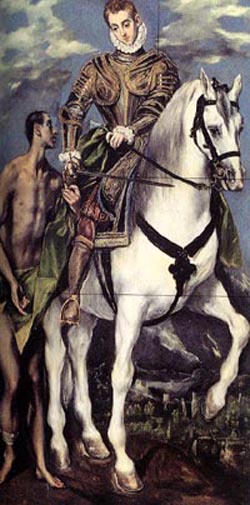 San Martín se representa con mayor frecuencia como un soldado romano que comparte su capa con un mendigo, arriba, o como lo estilizó El Greco, abajo