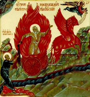 Desde el carro de fuego, Elías deja caer su manto sobre Eliseo |
