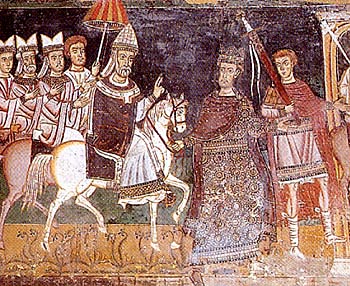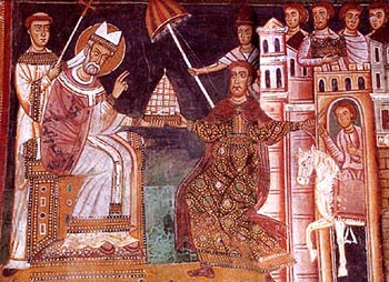 Sobre, Constantino ofrece una tiara al Papa Silvestre. Abajo, El Emperador conduce al Papa en triunfo