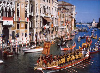 El bucintoro , un barco especial utilizado por los Dogos para ocasiones solemnes, sale al mar rodeado de pequeñas regatas con la nobleza veneciana. |
