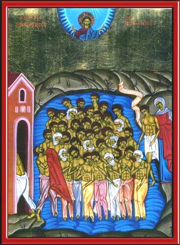 Los 40 mártires de Sebaste en Armenia fueron azotados, torturados y encarcelados, pero no cedieron. Finalmente, el gobernador Lisias ideó un tipo extraordinario de muerte que esperaba sacudiría su constancia. Ordenó que los soldados fueran colocados en un estanque de agua helada y dejados durante toda una noche de invierno.