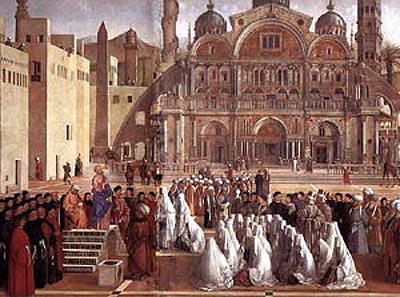 San Marcos predicando en la plaza de Alejandría. Se puede ver que los conversos adoptaron formas monásticas de vestir
