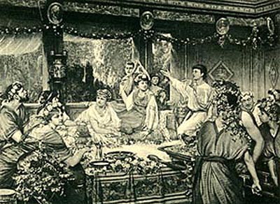 Cuando alguien se había hartado de comida y bebida y no podía más, había lugares como nuestros baños donde los esclavos les hacían cosquillas en la garganta con una pluma para poder vomitar todo. Luego se aseaban con agua y perfumes, se secaban las manos en los cabellos largos de las esclavas que allí estaban para ese fin, y volvían a las salas del banquete a comer y beber de nuevo.