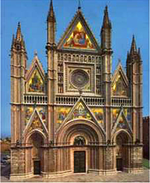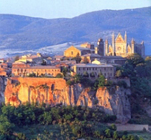 Encima, la ciudad de Orvieto está construida sobre un alto acantilado. Abajo, la catedral gótica de Orvieto con su fachada de mosaico.