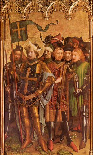Una compañía de caballeros defiende a Nuestra Señora y la Iglesia en esta pintura en un altar lateral del Duomo, Italia