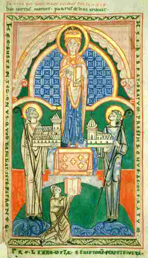 San Esteban Harding, derecha , y el abad benedictino de San Vaast, izquierda, presentan modelos de sus iglesias a Nuestra Señora - Bibliotheque Municipal Dijon