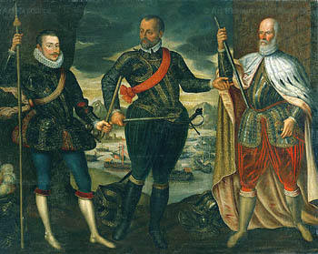 Comandantes de las flotas católicas. De izquierda a derecha , Don Juan de Austria, Marco Antonio Colonna y el Dux veneciano Sebastian Venier