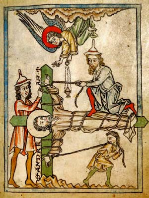 Dos judíos (con gorras) atando a San Andrés a la cruz