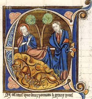 San Patricio descansando sobre una roca. Debajo hay animales dormidos que representan a los inconversos. Manuscrito iluminado del siglo XIII