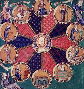 Una pintura medieval apunta a Cristo como el centro de la vida de un hombre a través de sus Diez Edades, desde el nacimiento hasta el ataúd