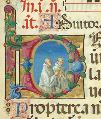 Podemos imaginar a los dos hermanos ermitaños rezando, arrodillados uno al lado del otro, así los representaría una iluminura, rezando devotamente y la Virgen sonriéndoles desde el Cielo, un Cielo representado en una atmósfera de azul diáfano, en los azules de Fra. Angelico. Esta sería la primera iluminura.