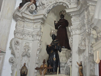 Estatuas de San Benito, arriba, y San Antonio de Catala Girona en la Iglesia Nuestra Señora del Rosario de los Hombres Negros en São João del Rey, Brasil