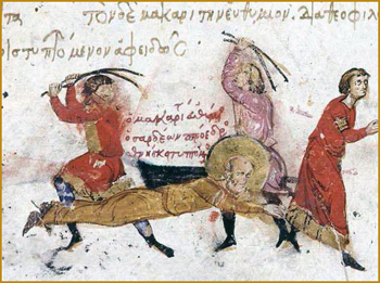 El emperador lo arrestó nuevamente y ordenó que lo torturaran con brasas ardientes y hierro al rojo vivo que lo quemaron hasta los huesos. No murió y volvió a prisión.