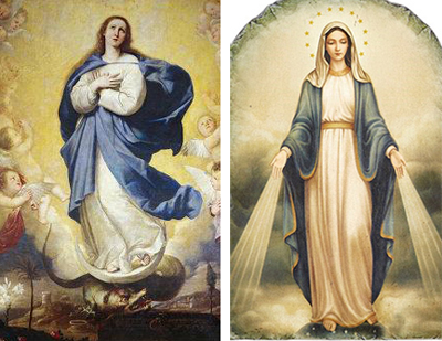 A la izquierda, una representación de la Inmaculada Concepción, a la derecha, Nuestra Señora de las Gracias como apareció en la Medalla Milagrosa.