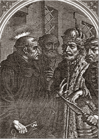Se dirigió solo a la puerta de la Abadía y, dirigiéndose al Emperador, dijo: "Señor, recibiría a Vuestra Señoría con todos los debidos honores reales si no supiera que nuestro Señor Apostólico [el Papa] te ha separado de la Iglesia"