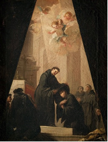 Ángeles querubines volando por encima agregan una nota de sentimentalismo a la pintura de Gaspar ingresando a la religión.