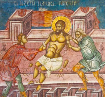 Jacob era de una familia ilustre. Había sido cristiano y abandonó la fe. Pero su esposa y su madre lo trajeron de regreso a la Religión Verdadera. El rey Bahram ordenó que todos los miembros de su cuerpo fueran cortados en pedazos por las articulaciones. Finalmente, solo quedó su baúl, y como seguía confesando a Jesucristo, fue decapitado.