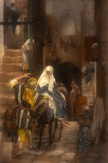 “Entraron en Belén, los edificios estaban a cierta distancia entre sí. La entrada estaba a través de paredes en ruinas, como si la puerta hubiera sido destruida. María permaneció con el burro en la entrada de la calle, mientras que José buscó en vano un alojamiento en las casas más cercanas”.