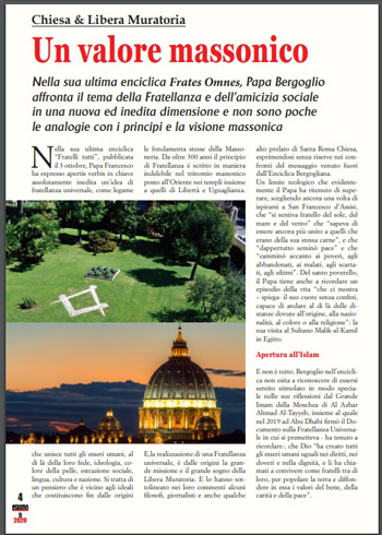 La revista Grand Orient de Italia publicó un artículo alabando Fratelli tutti en este octubre 2020 publicación