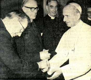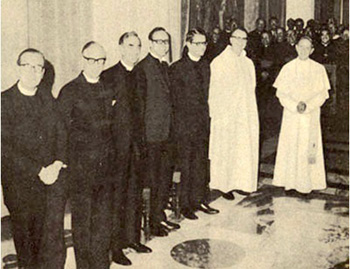 Paulo VI con los protestantes que ayudaron a escribir la Nueva Misa; debajo, los seis teólogos protestantes de esa Comisión