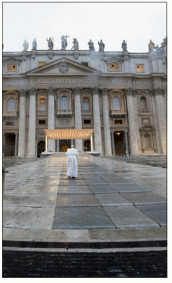Luego, imagina a Francisco apareciendo en escena para resolver el conflicto: "En un cuadro de desolación y silencio, Francisco entra al campo como el gran intercesor. Reanuda el diálogo con el pueblo con su Urbi et Orbi [en la ciudad y en el mundo], tomando la iniciativa de caminar solo por una calle de Roma en peregrinación al Crucifijo 'milagroso' de San Marcelo… El 27 de marzo habló (rompiendo el apagón mediático) en una plaza de San Pedro vacía bajo una lluvia constante. Solo y frágil, viejo y con pasos temblorosos, se colocó - casi combativo en su oración - contra un mal de dimensiones ilimitadas". (pág.153)