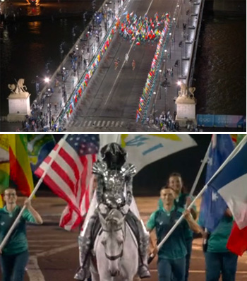 Me informaron que muchos en Internet consideran que este jinete con su caballo representa a la Muerte, haciendo referencia al tercer caballero de el Apocalipsis que cabalga sobre un caballo pálido (Ap 6,8). Sin embargo, el caballo que apareció en esa ceremonia no era pálido, sino plateado en el paseo por el Sena, y claramente blanco cuando el hombre enmascarado cabalgó desde la Torre Eiffel hasta el Trocadero liderando a los atletas de todas las naciones a lo largo del Pont d’Iena (Puente de Iena).