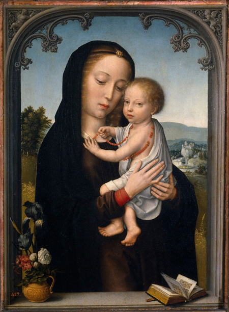 le da al Niño Jesús el regalo de su lana de oveja, con la cual Nuestra Señora