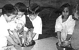En una escuela primaria católica en Aurora, Indiana, niños y niñas con camisetas y pantalones de mezclilla trituran tazones de uvas en la cafetería de la escuela para hacer el vino para su Primera Comunión (The Leaven), el 8 de febrero de 2002). “Fue divertido”, dijo un niño de segundo grado. Aplastaron las uvas con las manos, agregaron agua y luego removieron el jugo de uva dos veces al día. Ahora el jugo está en recipientes herméticos en las aulas para que puedan observar el proceso de fermentación. También hicieron y decoraron los cálices y platos que se usarían “para distribuir la Comunión”.