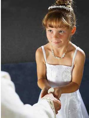 Por este motivo, el vestido blanco y el velo que simula un vestido de novia es la vestimenta ceremonial más apropiada. Porque, en cierto modo, toda niña se convierte en esposa de Cristo en su primera unión espiritual con Aquel que está plenamente presente, en Cuerpo y Sangre, en la Sagrada Hostia. En su Autobiografía, Santa Teresa de Liseaux describe su Primera Comunión como “¡el primer beso de Jesús a mi alma!