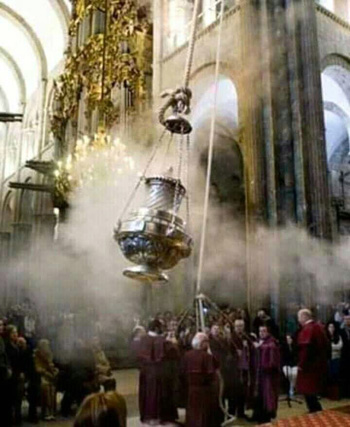 Durante la Misa, el famoso Botafumero, el incensario de seis pies y medio de alto, se balancea a través de los pasillos acompañado por el sonido de las chirimías (largas flautas de plata quizás de origen morisco).