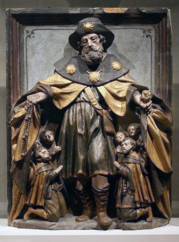 La ubicación de Compostela cerca del océano la convirtió en una zona rica en conchas de vieira, que los peregrinos recogían como emblema de su arduo viaje. Por esta razón, la concha de peregrino se convirtió en un estandarte de Santiago y una parte integral del atuendo del peregrino. Los peregrinos llevaban con orgullo vieiras o conchas de berberecho en sus sombreros o capas.